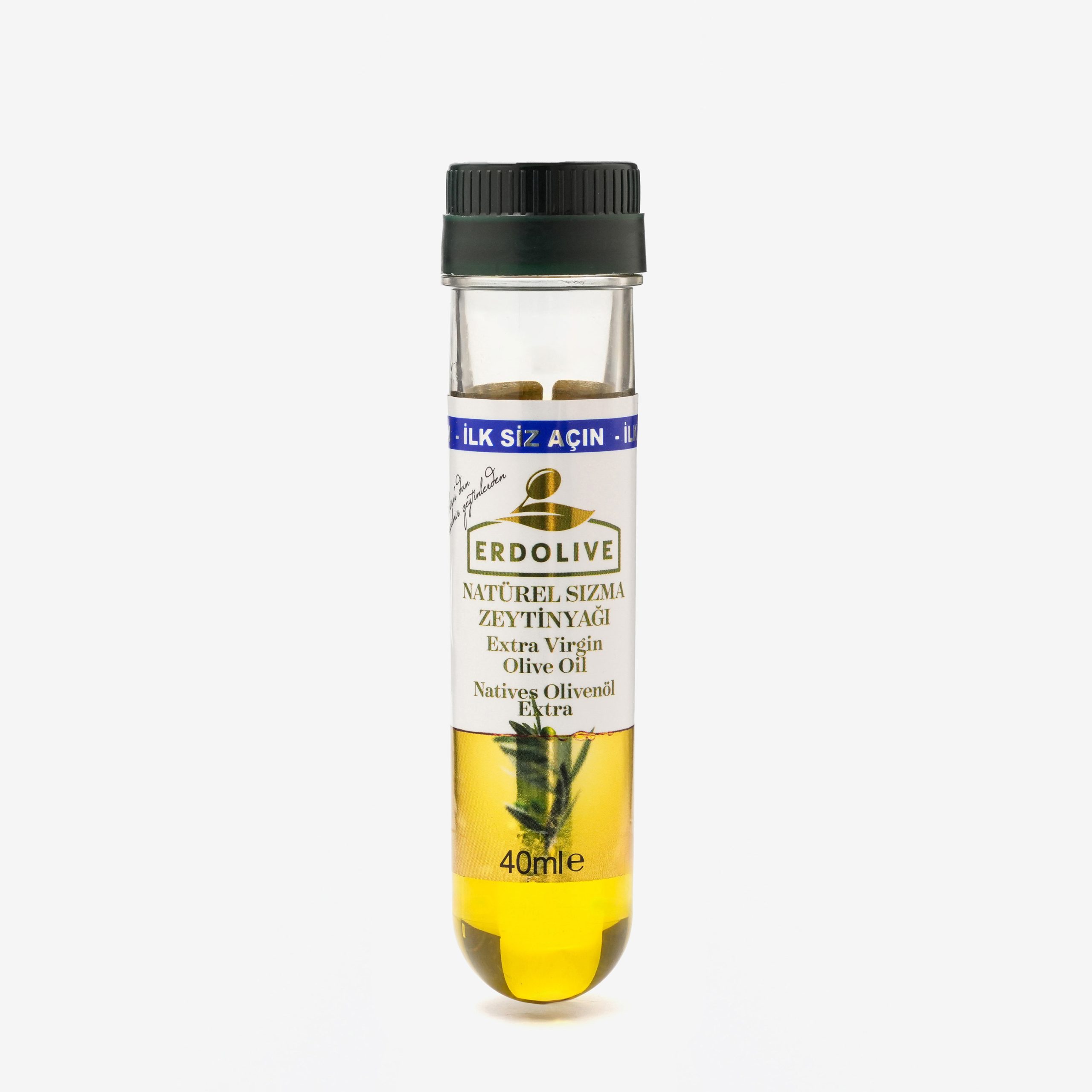 Erdolive 40 mililitre Natürel Sızma Zeytinyağı, Ege Bölgesi’nin yağlık zeytinlerinin yalnızca mekanik olarak işlenmesiyle elde edilmiş üstün kalitede bir zeytinyağıdır.